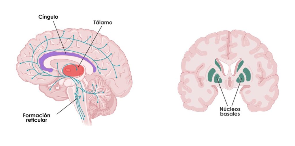 - Ganglios basales: Son la interfaz atencional que conecta la formación reticular, el sistema límbico y la corteza cerebral. Ayudan en la focalización y selección de la atención, además de integrar procesos emocionales en la misma.