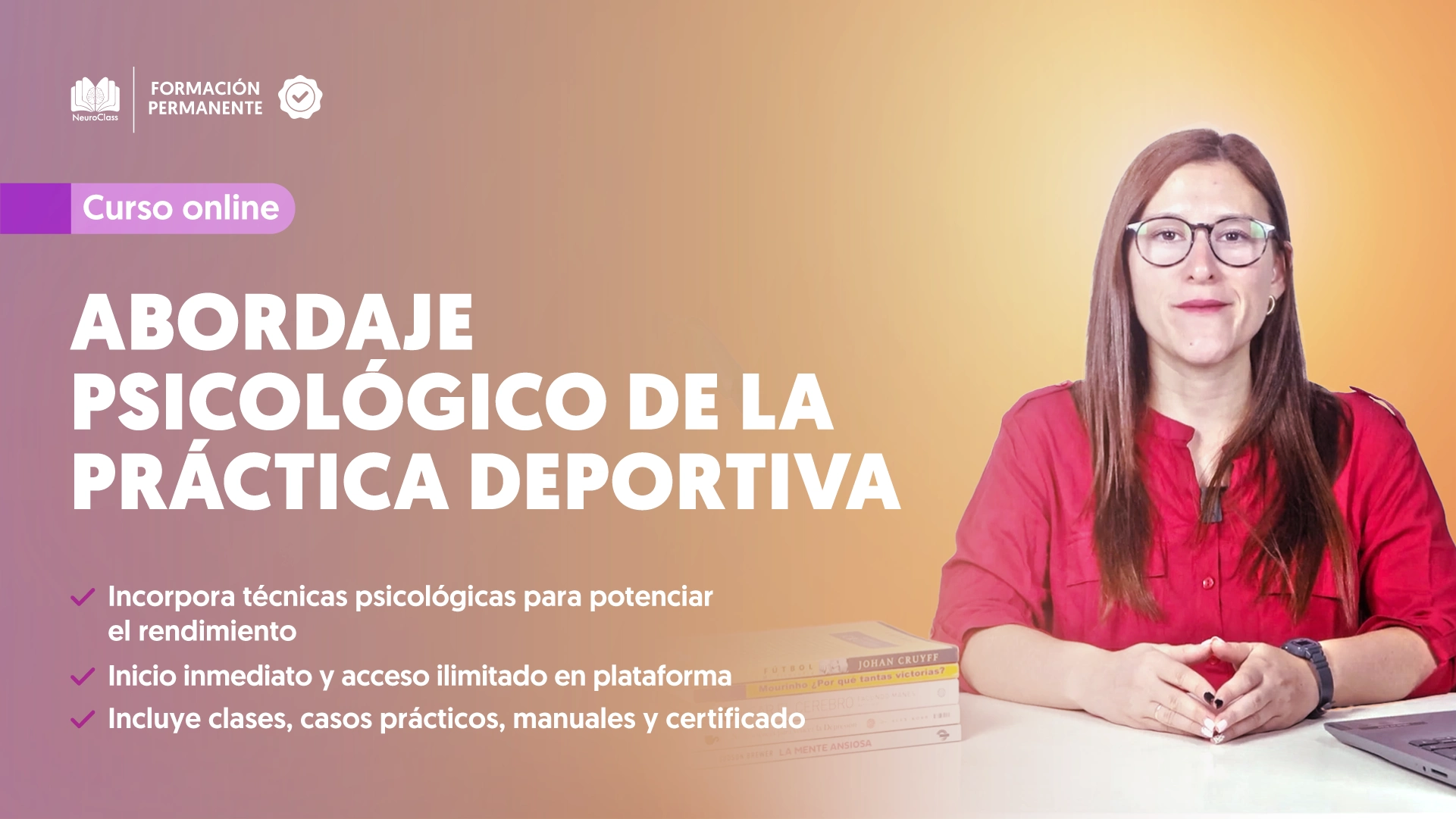 A lo largo de este curso, aprenderás a identificar y manejar las consecuencias negativas de la práctica deportiva, implementar técnicas de entrenamiento mental, y entrenar habilidades psicológicas clave como el autoconocimiento, la autoconfianza y la motivación.