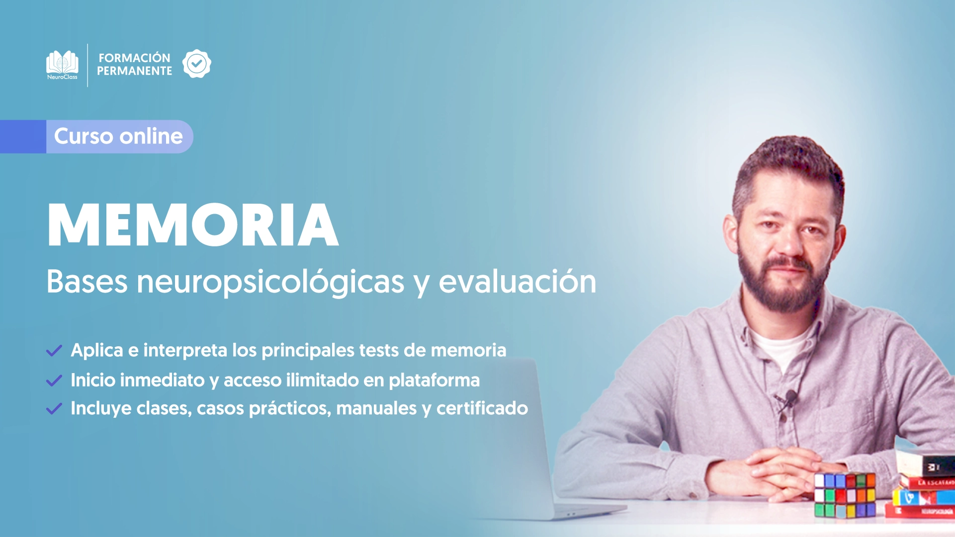 - Dirigido a profesionales y estudiantes interesados en la valoración neuropsicológica, este curso ofrece herramientas teóricas y prácticas para comprender y evaluar las bases de la memoria en diferentes contextos.