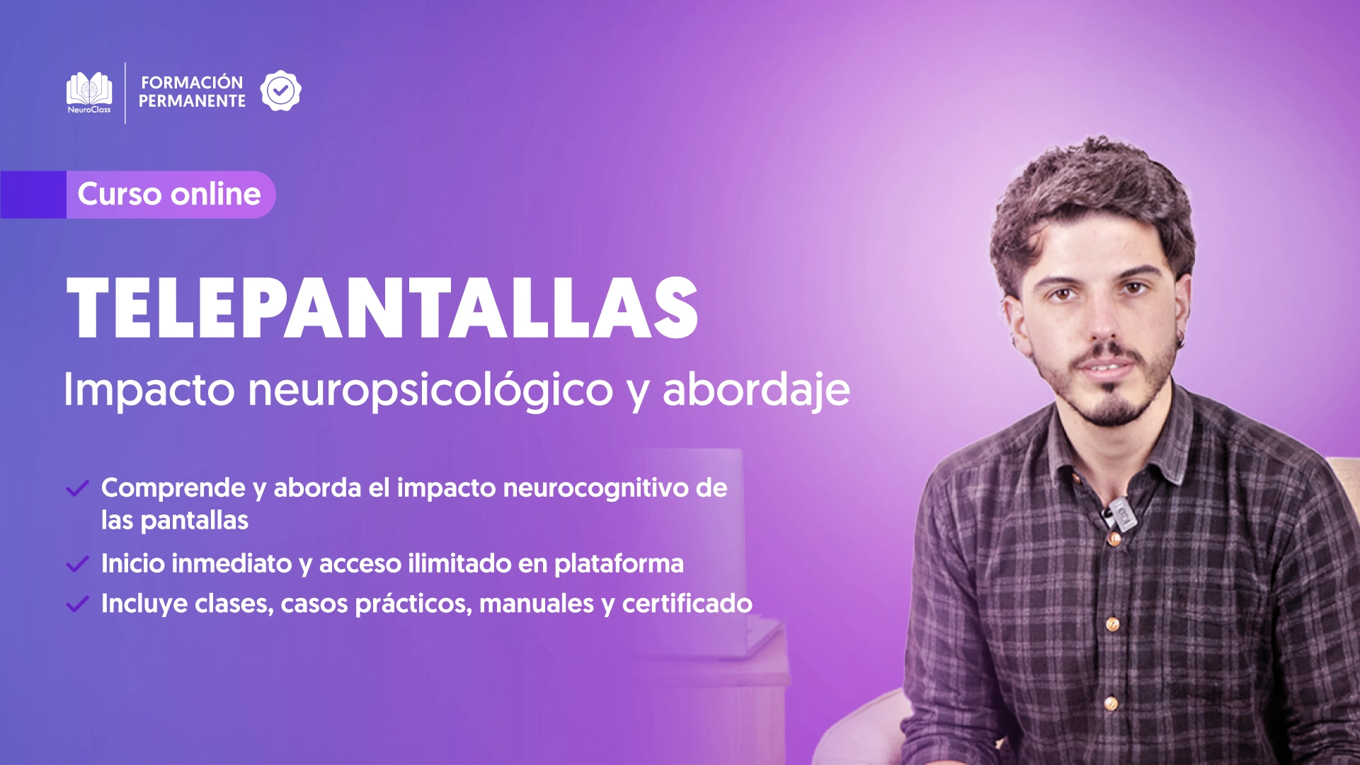 - Este curso está dirigido a estudiantes y profesionales de la psicología, la educación y familias interesadas en comprender y abordar el uso excesivo de pantallas desde una perspectiva neuropsicológica. A lo largo de cuatro lecciones, aprenderás a identificar cómo el sistema de recompensas influye en el uso de dispositivos, los efectos de la sobreestimulación en distintas etapas vitales y su impacto en el sueño y el comportamiento.