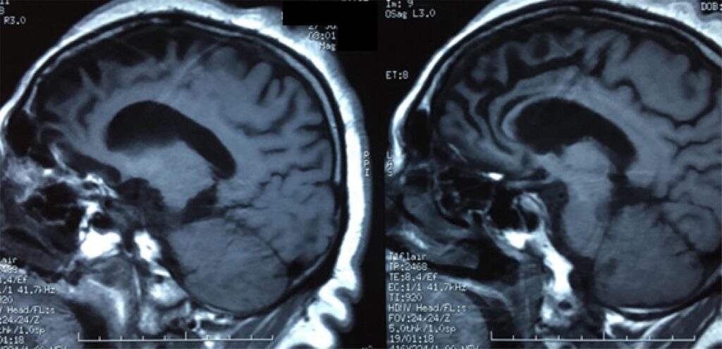 A nivel anatómico, se observa una pérdida cortical predominante en el hemisferio izquierdo, afectando la circunvolución frontal inferior, corteza prefrontal y temporal, núcleo caudado y putamen.